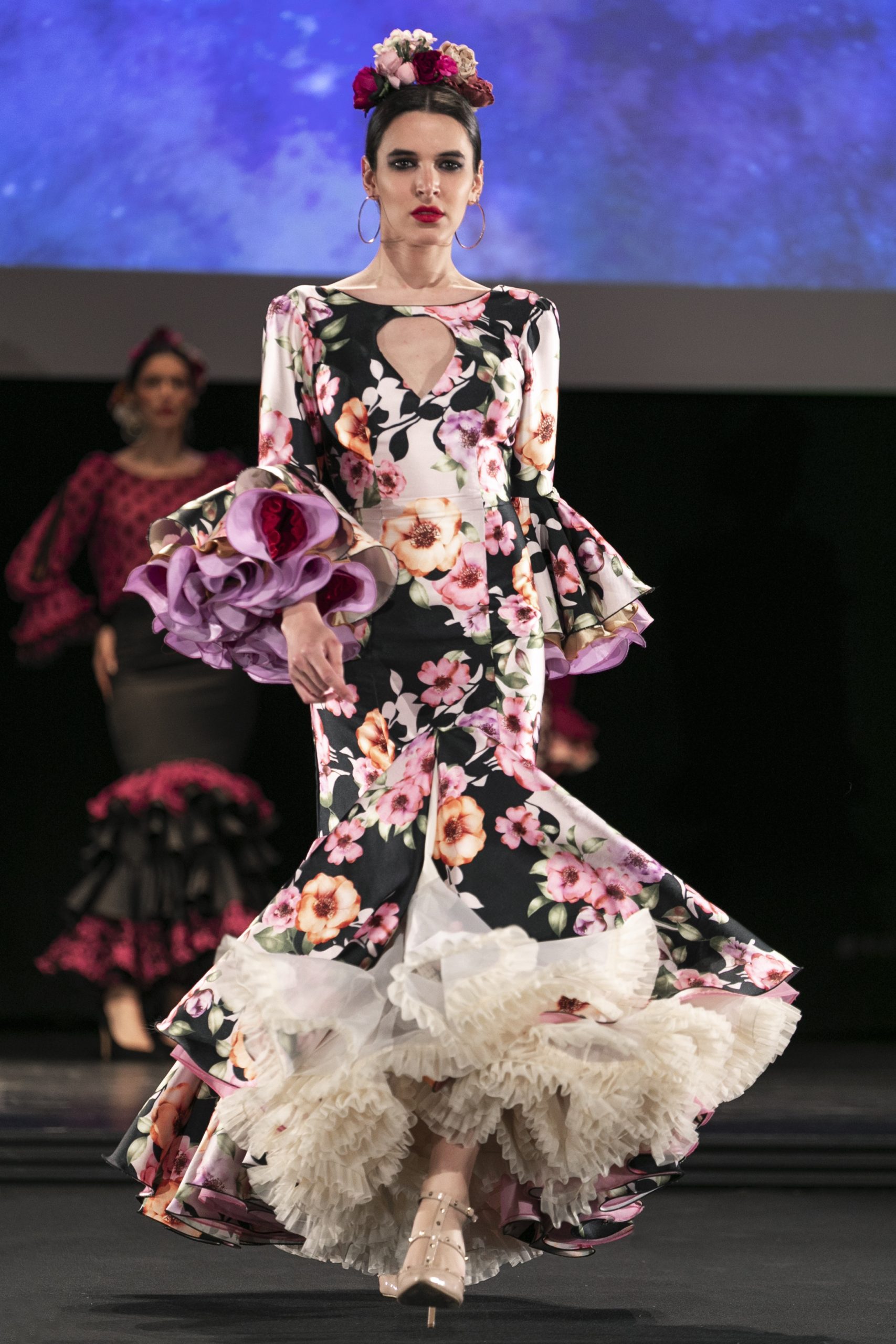 Vestido estampado floral entallado a la rodilla desde donde sale un gran volante con abertura y con enagua de gran volumen, con mangas lardas de grandes volantes unidos con volantitos para simular flores, escote de barco con abertura y en U en la espada.